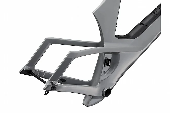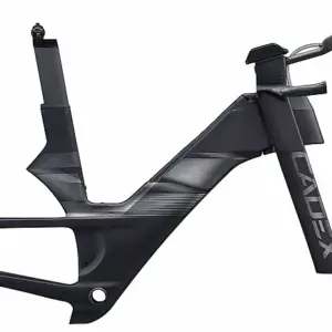 The unique chassis of the Cadex Tri frameset—a massive down tube with no top tube—offers a complete hydration bladder as well as nutrition and tool storage fully integrated into the frame. This design lets riders hydrate and refuel quickly and conveniently from the seated aero riding position while remaining totally self-sufficient on the course.