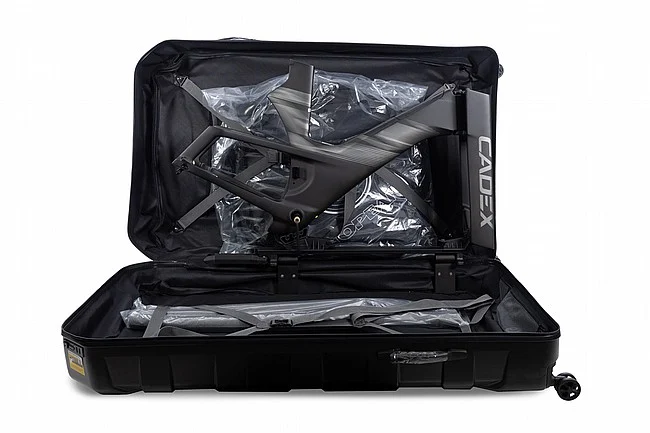 The case includes interior protection sleeves, a drivetrain cover, and a frameset mounting system to keep the frameset protected and secure inside the case. The mounting system can also be used as a mini work stand.