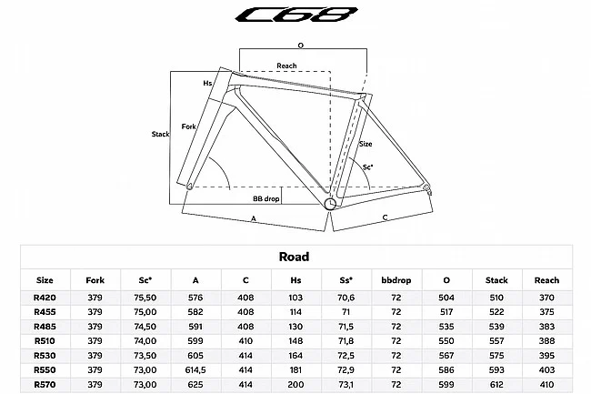 - Crank length: (Sizes 420 – 485): 170 mm, (Sizes 510 – 530): 172.5 mm, (Sizes 550 – 570): 175 mm