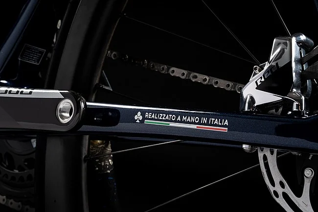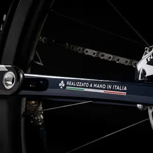 The frame is constructed from several carbon parts that are hand-assembled in Italy through joints and interlocks.