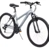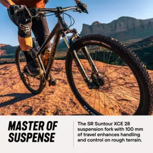 - SR Suntour XCE 28 suspension fork with 100 mm travel enhances handling and control on rough terrain