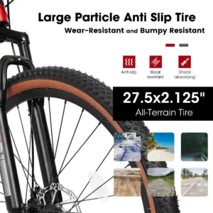 The tires are 27×2.125-inch all-terrain tires made of high-quality rubber. These tires have significant advantages. They have extremely strong puncture resistance, effectively avoiding the risk of flat tires caused by sharp objects on the road during the ride. When riding on different road surfaces, they can demonstrate excellent performance. Whether it’s a soft dirt trail, a gravel mountain road, or a flat asphalt road, the all-terrain tires can ensure a smooth ride. Their strong grip and excellent anti-skid function make the bike less likely to slip, ensuring that riders can maintain good control and stability under various road conditions.