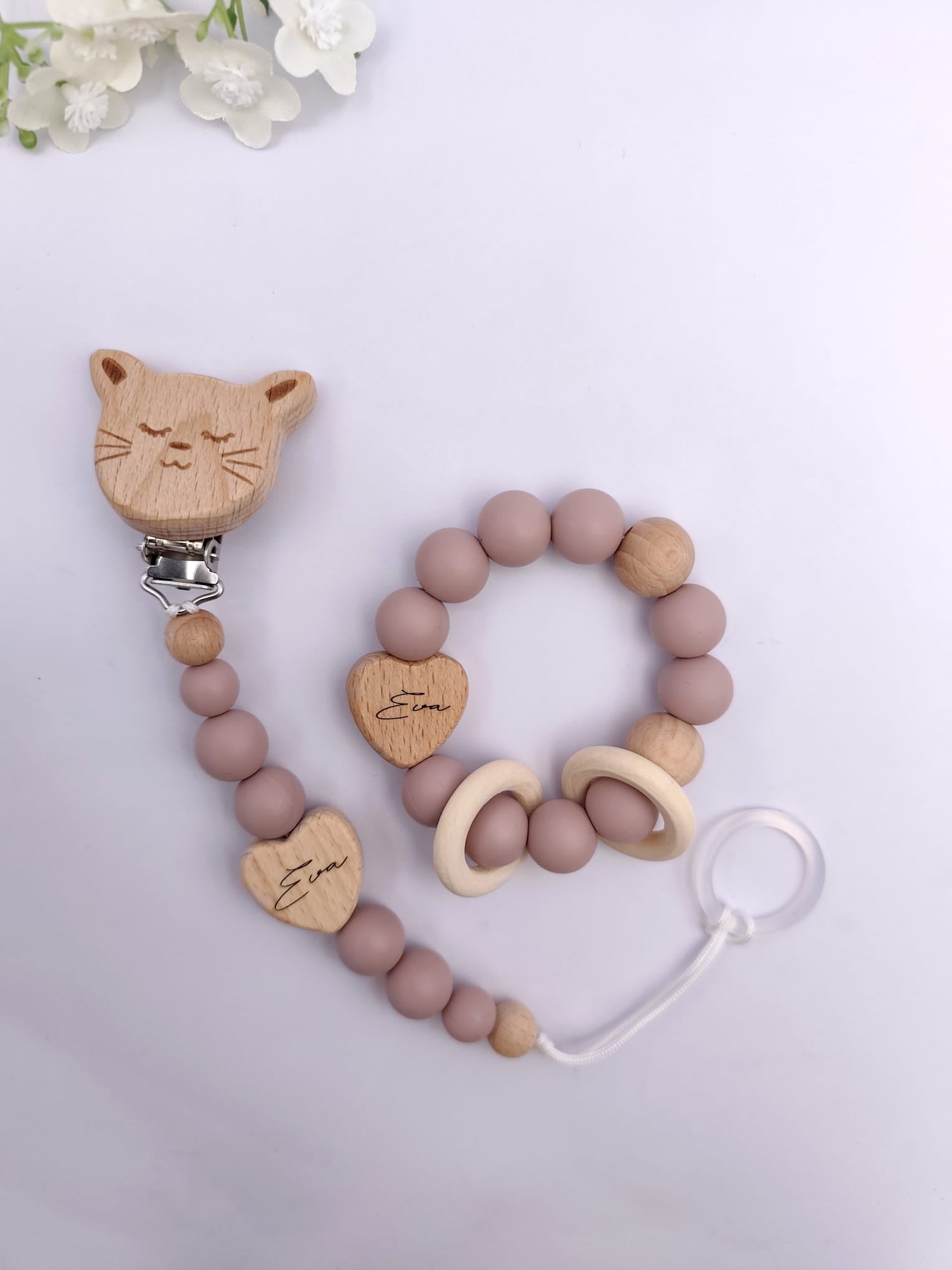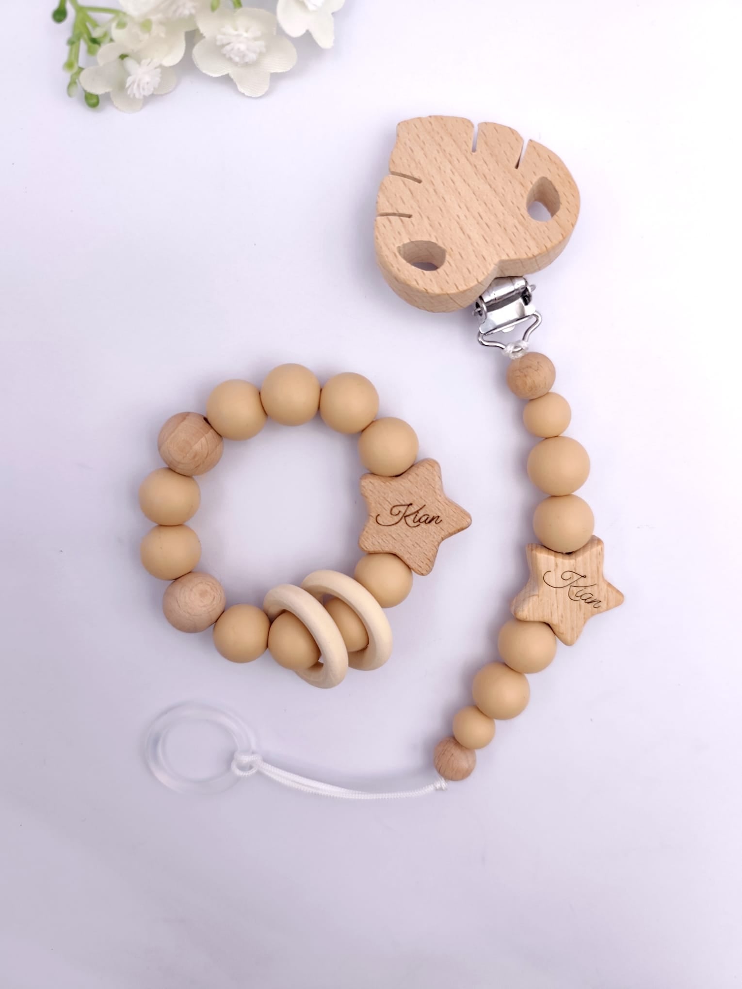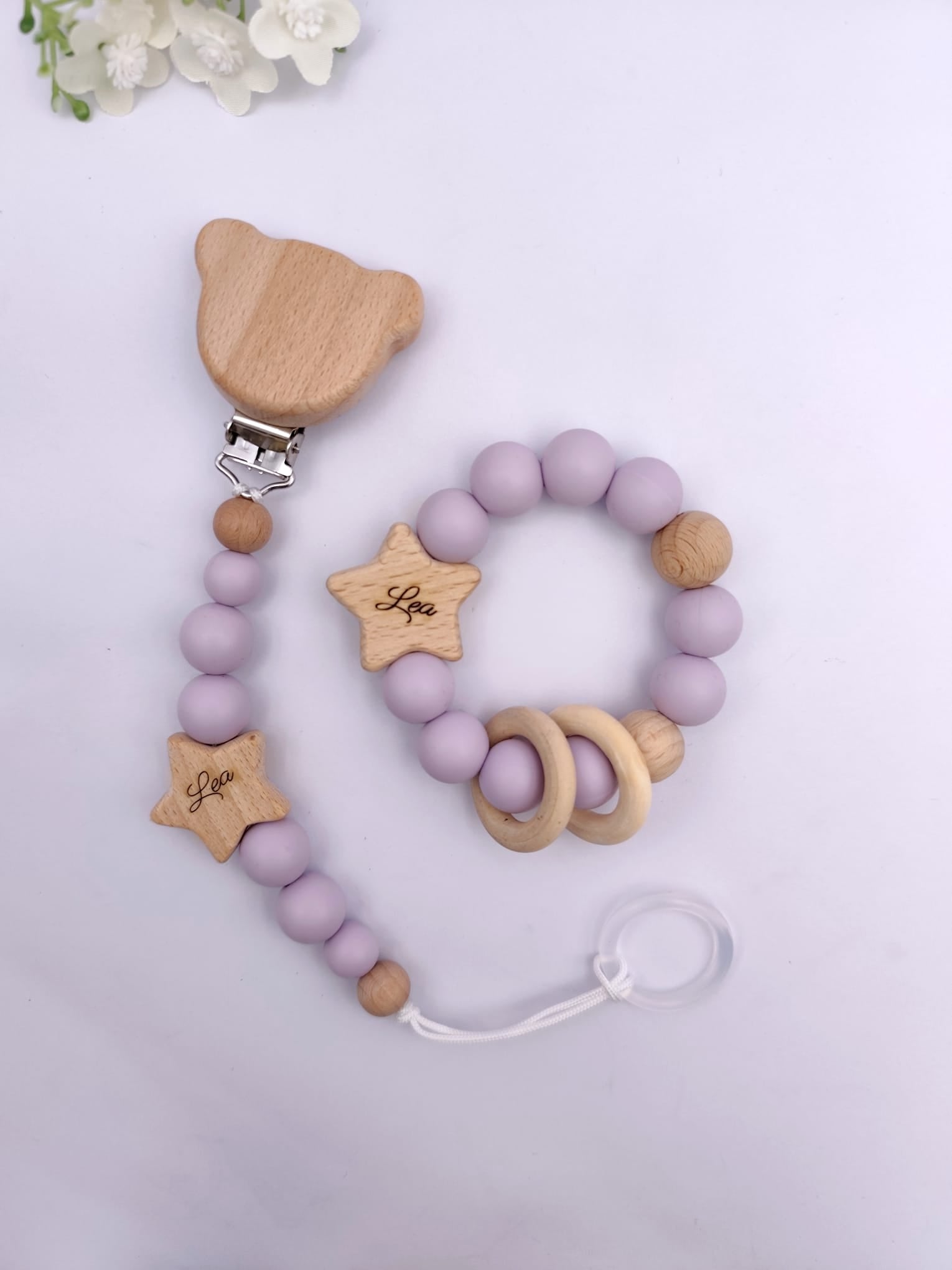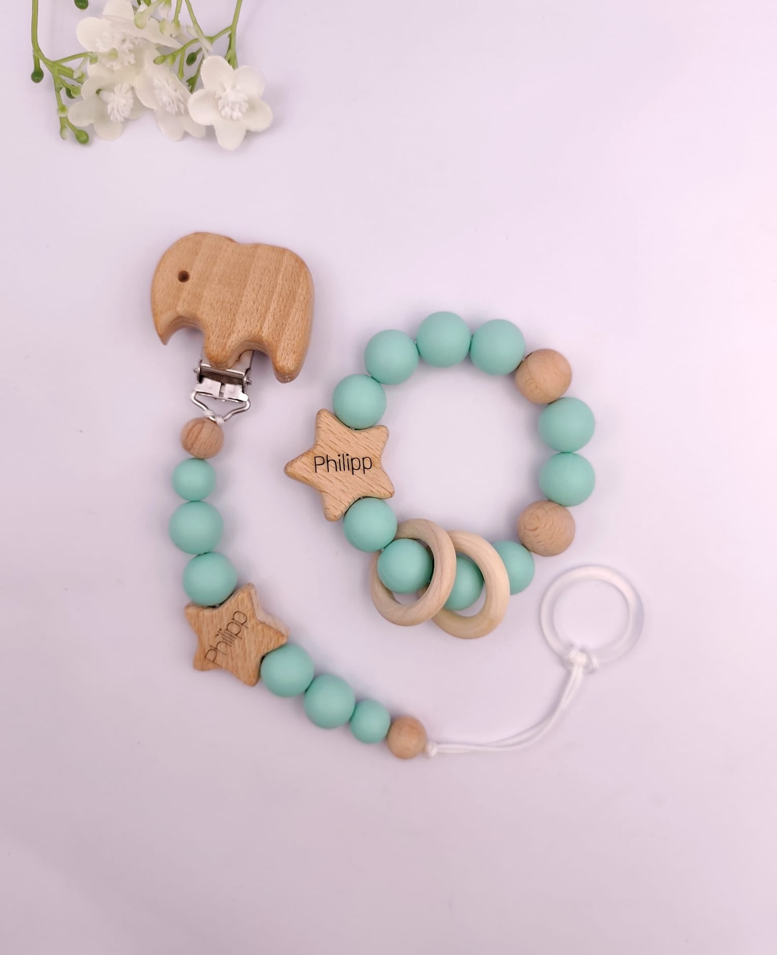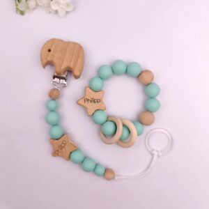 Pastell Schnullerkette & Greifling mit Namen | BPA-frei, handgemacht in Österreich, mit Namensgravur | Geschenk Geburt & Taufe