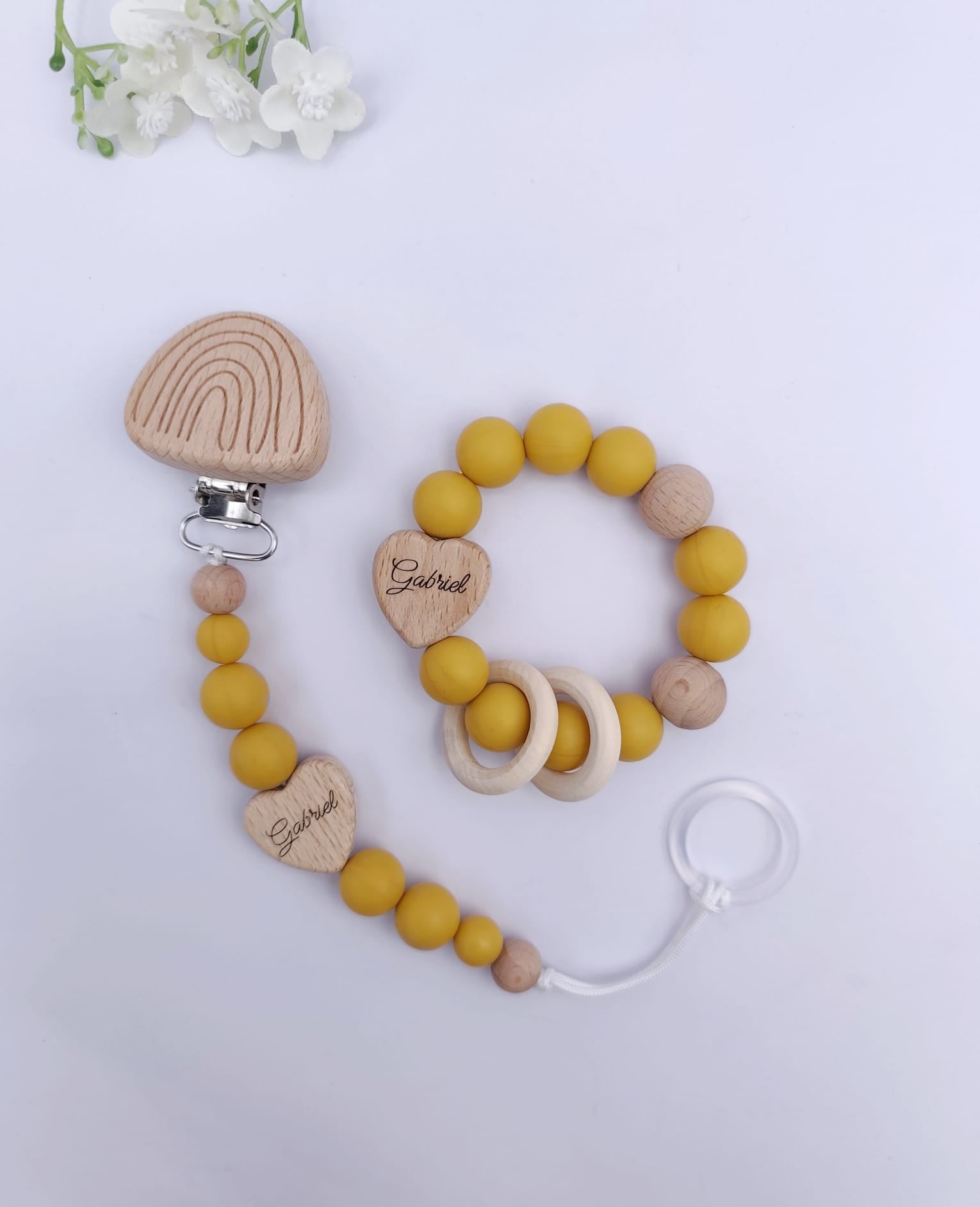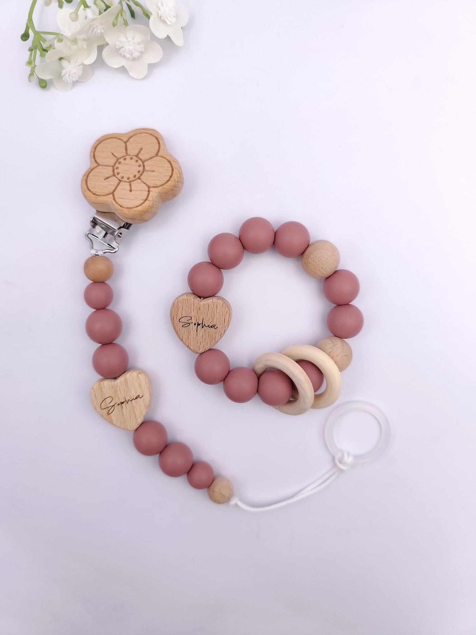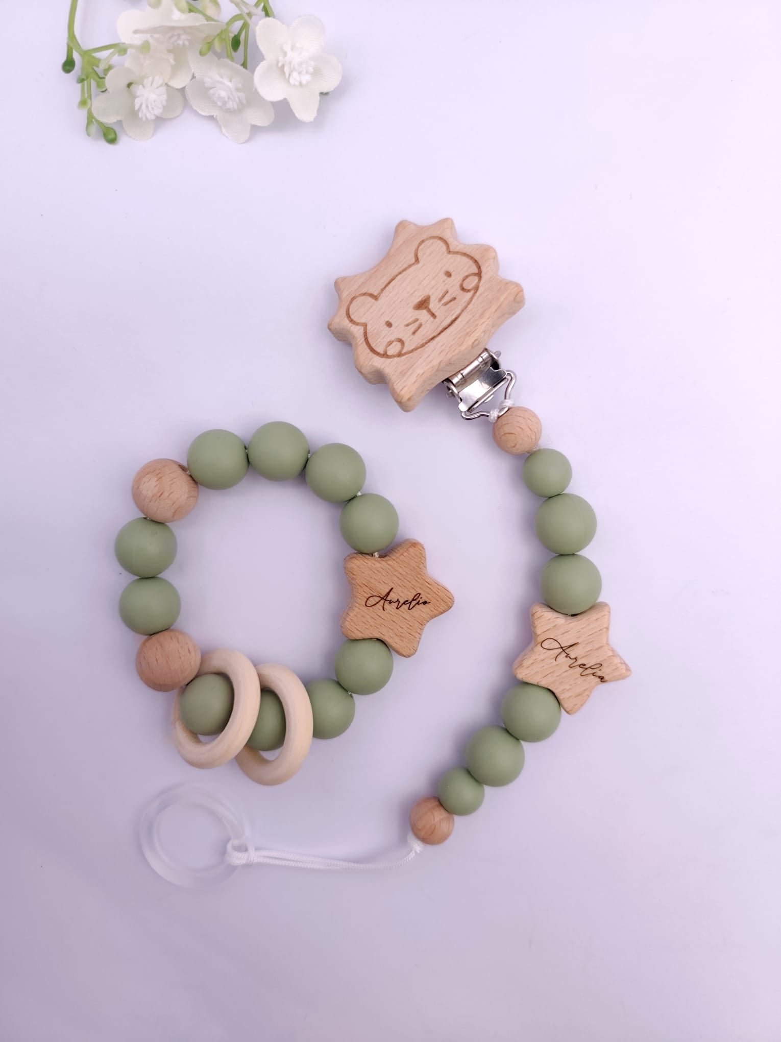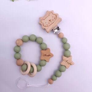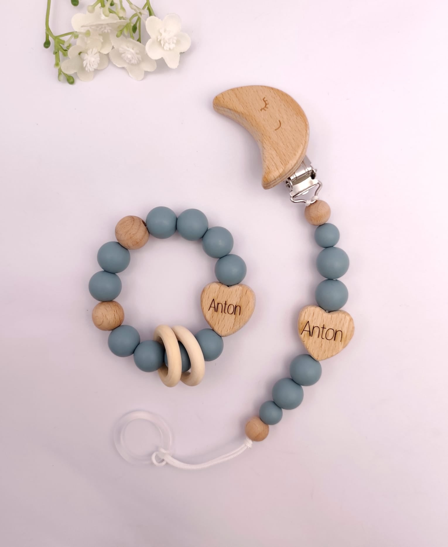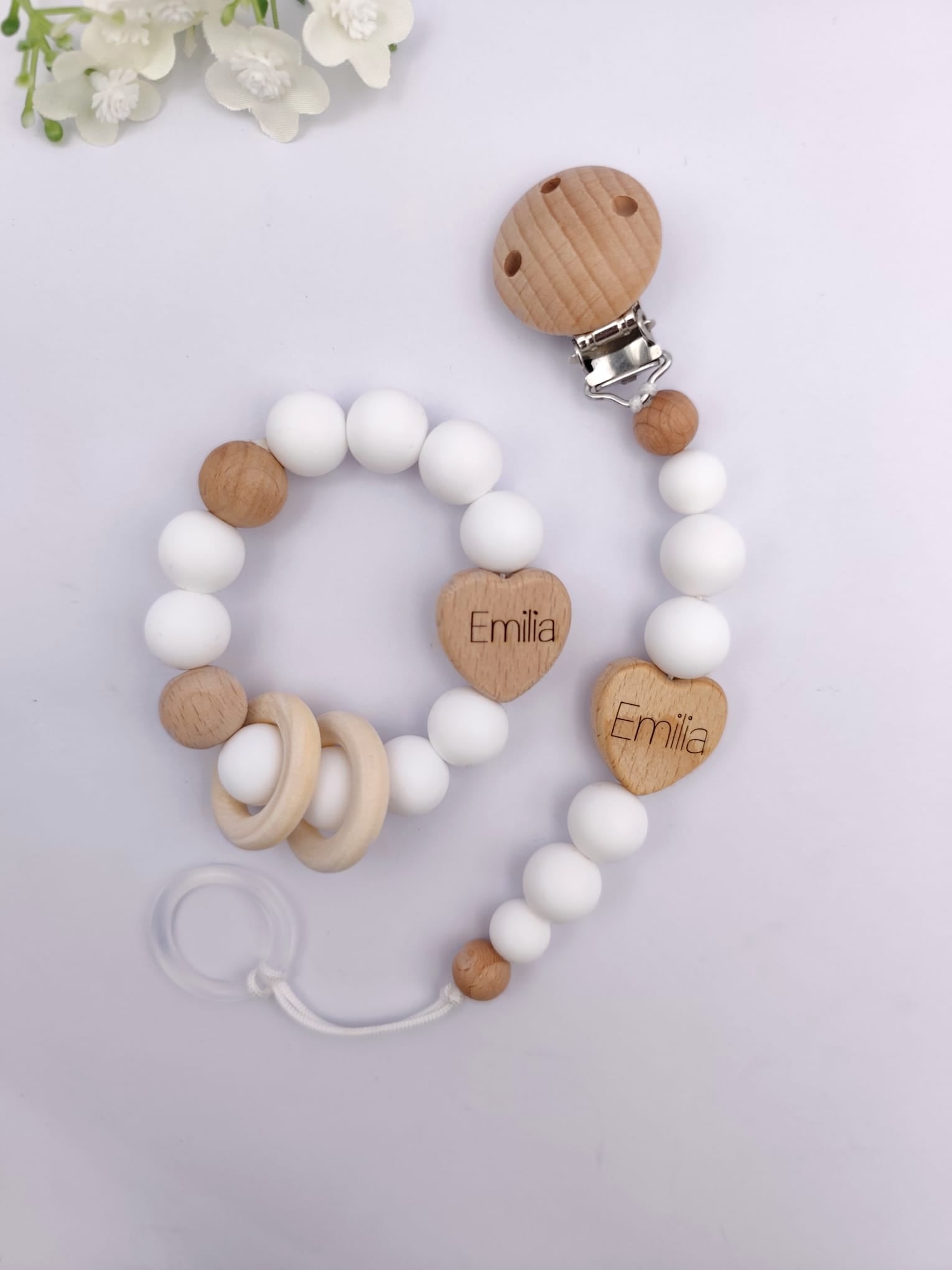 Pastell Schnullerkette & Greifling mit Namen | BPA-frei, handgemacht in Österreich, mit Namensgravur | Geschenk Geburt & Taufe