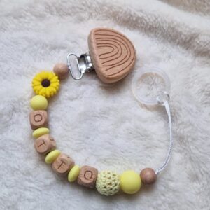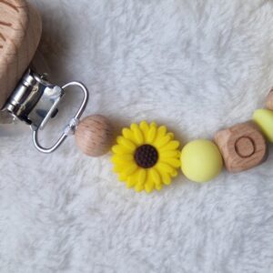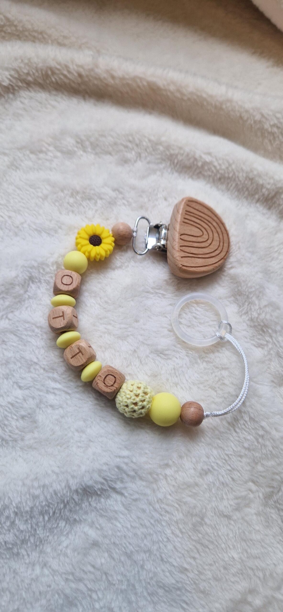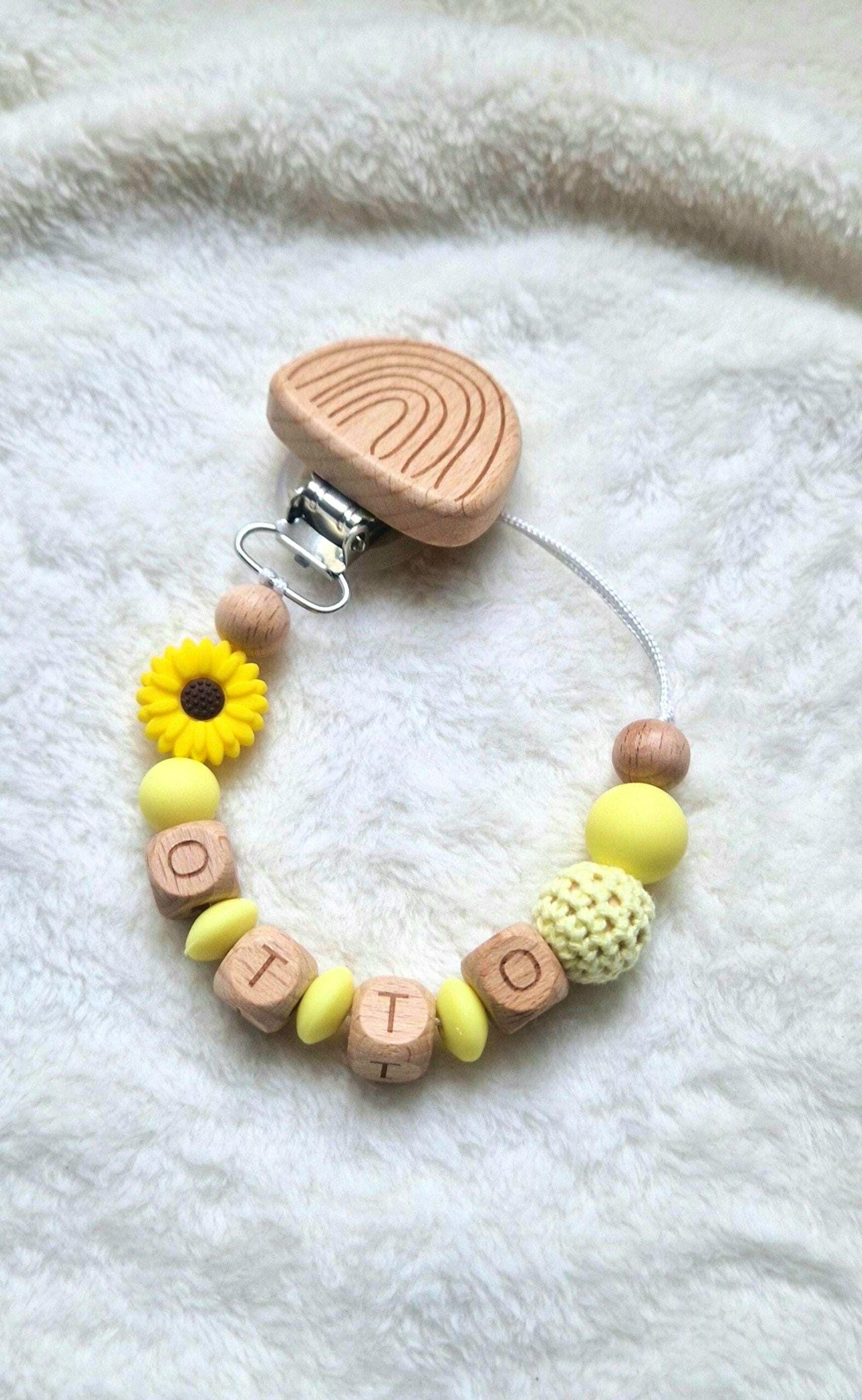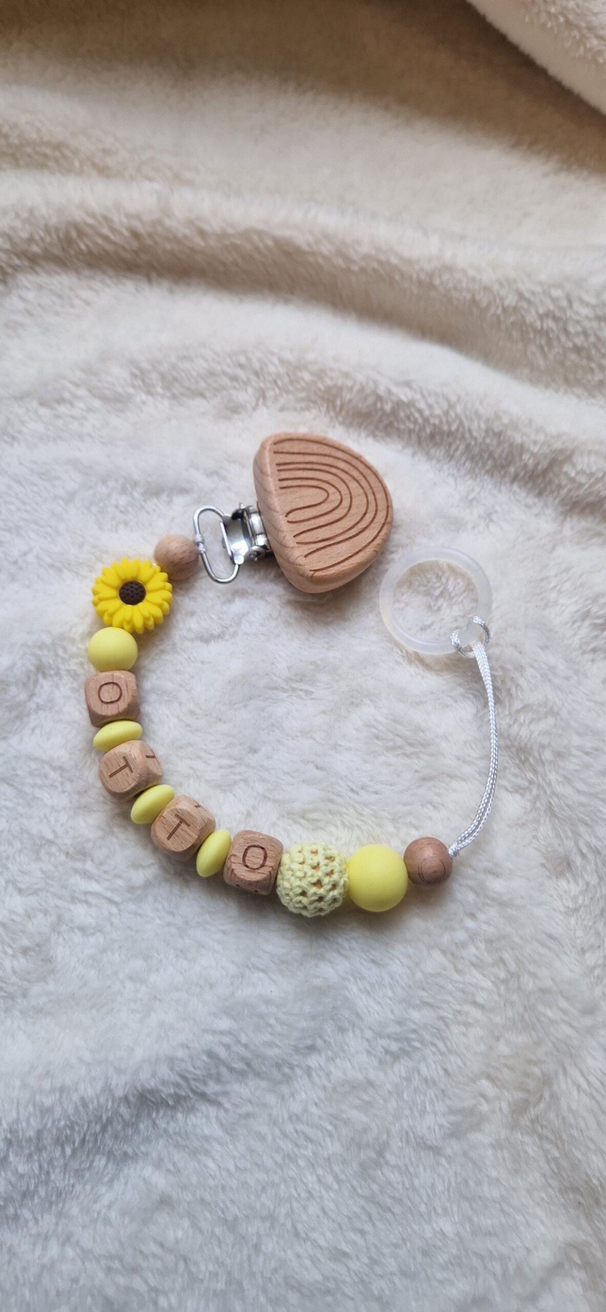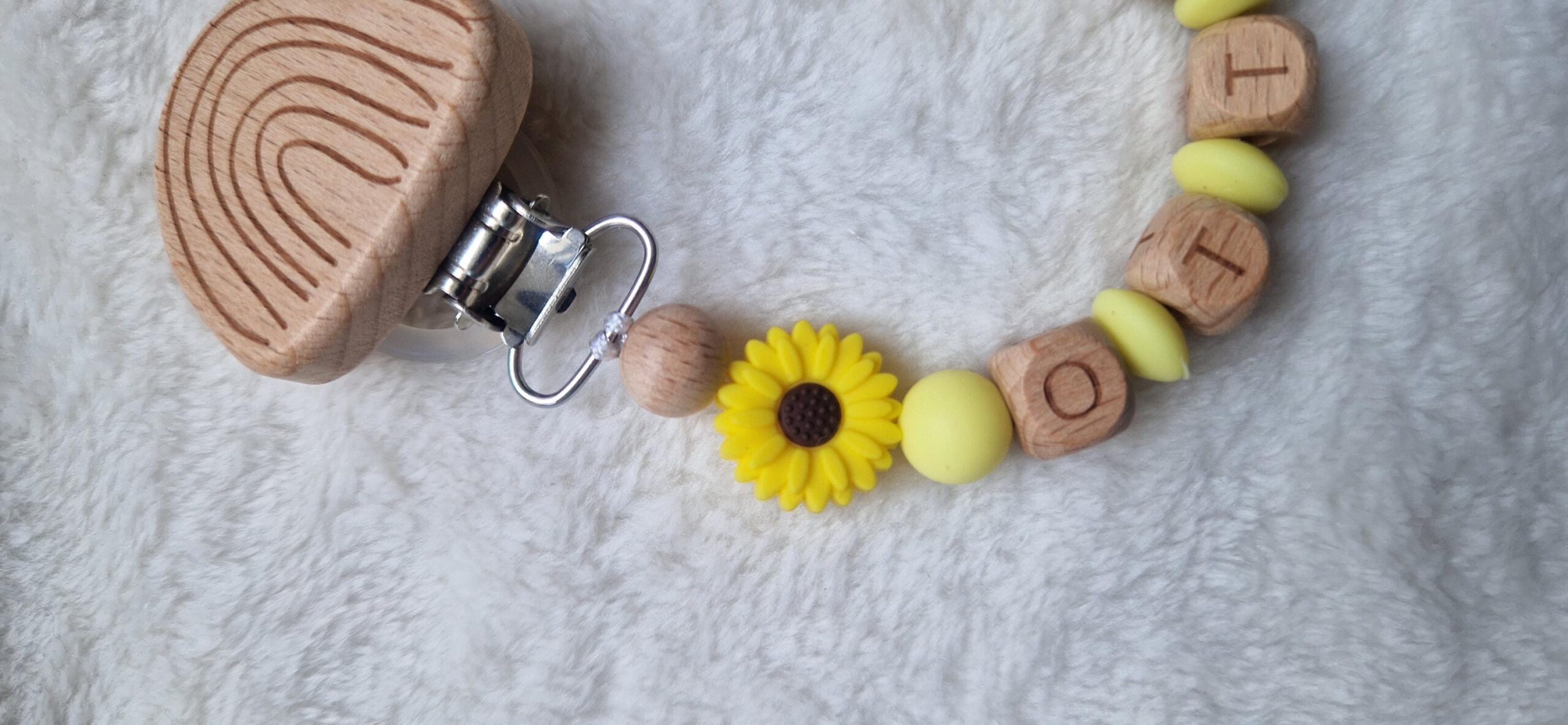 Personalisierte Schnullerkette gelb mit Blume und Namen – Handgefertigte Babygeschenke – Holzbuchstaben – Individuelles Geschenk zur Geburt
