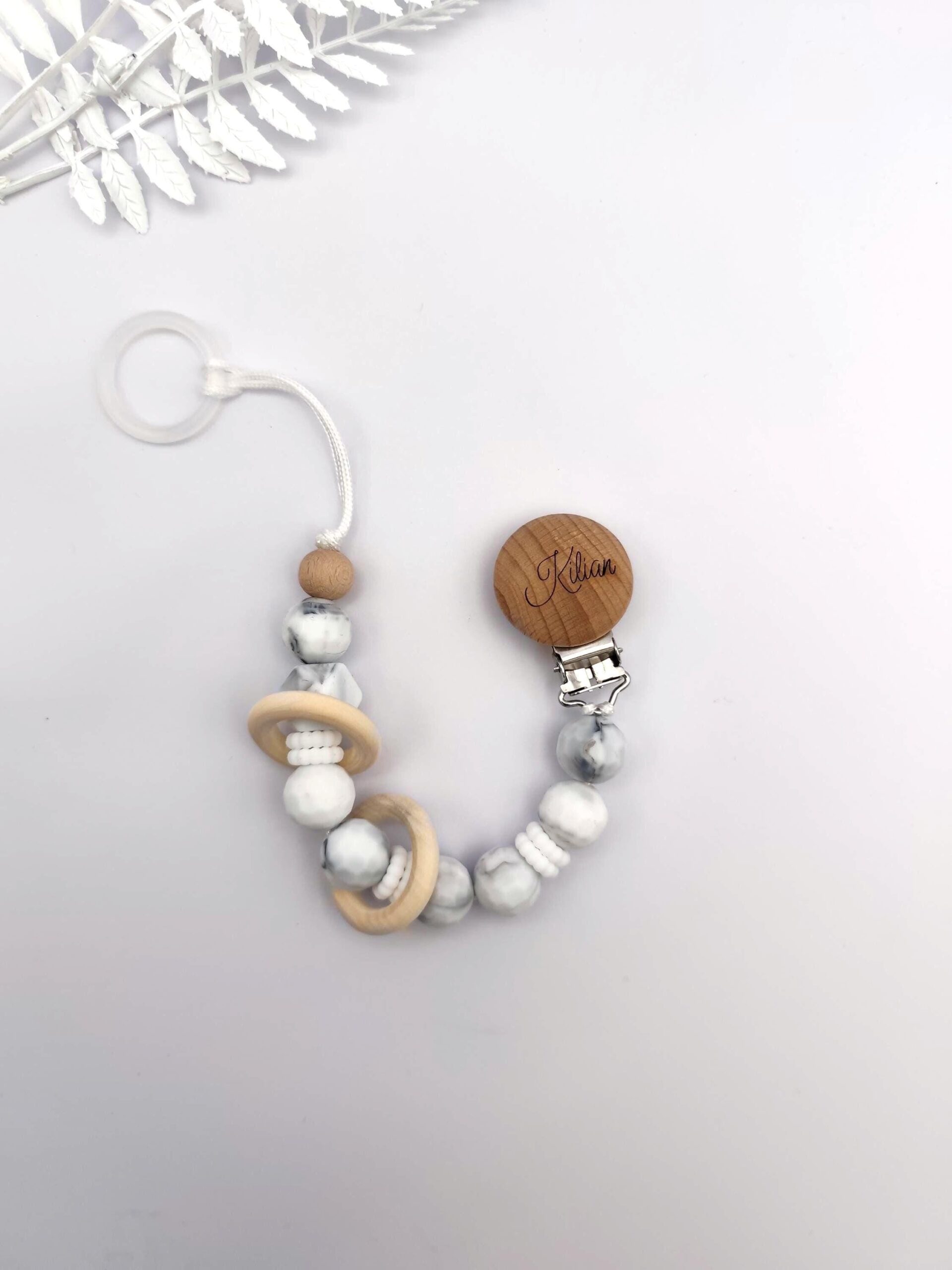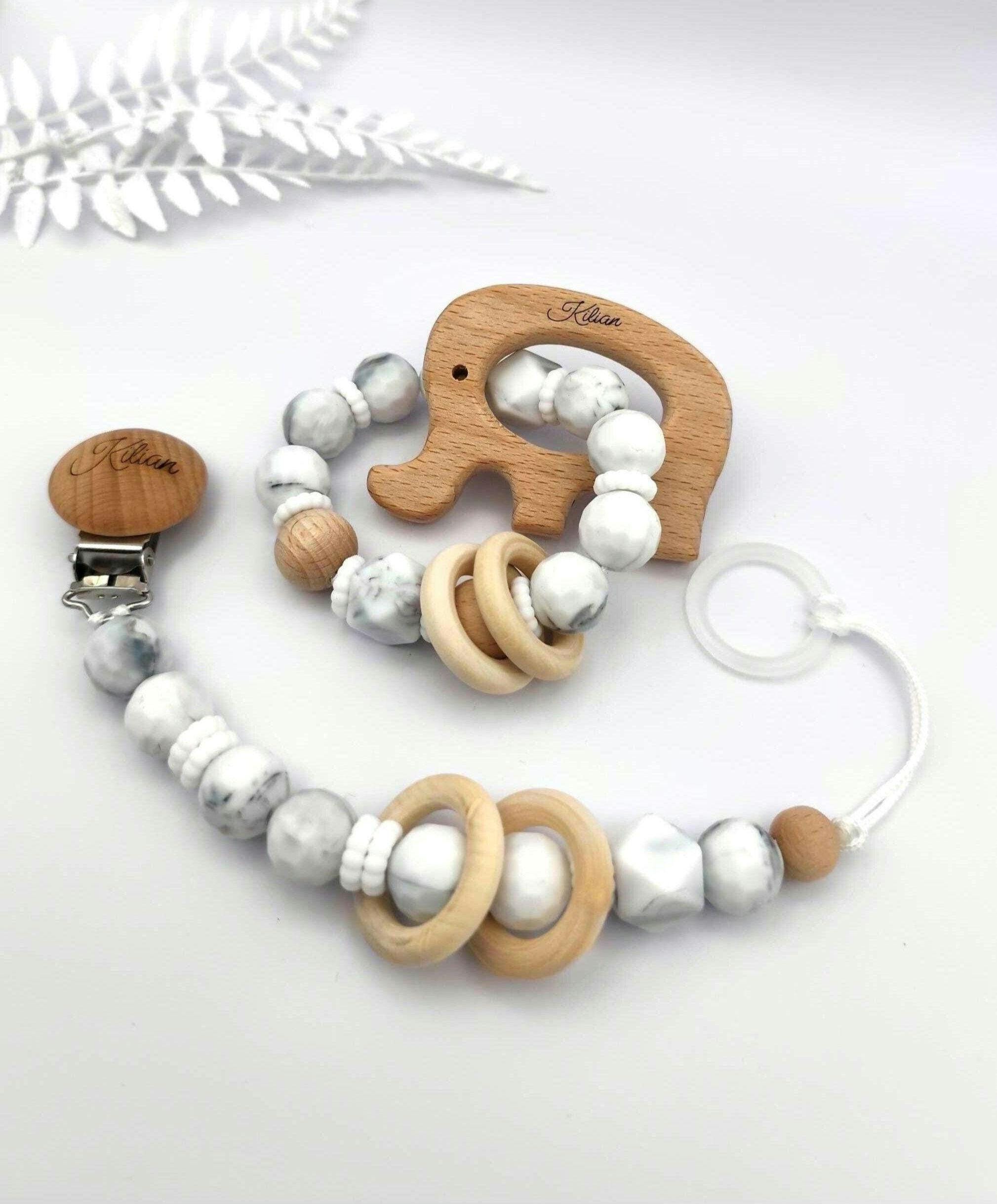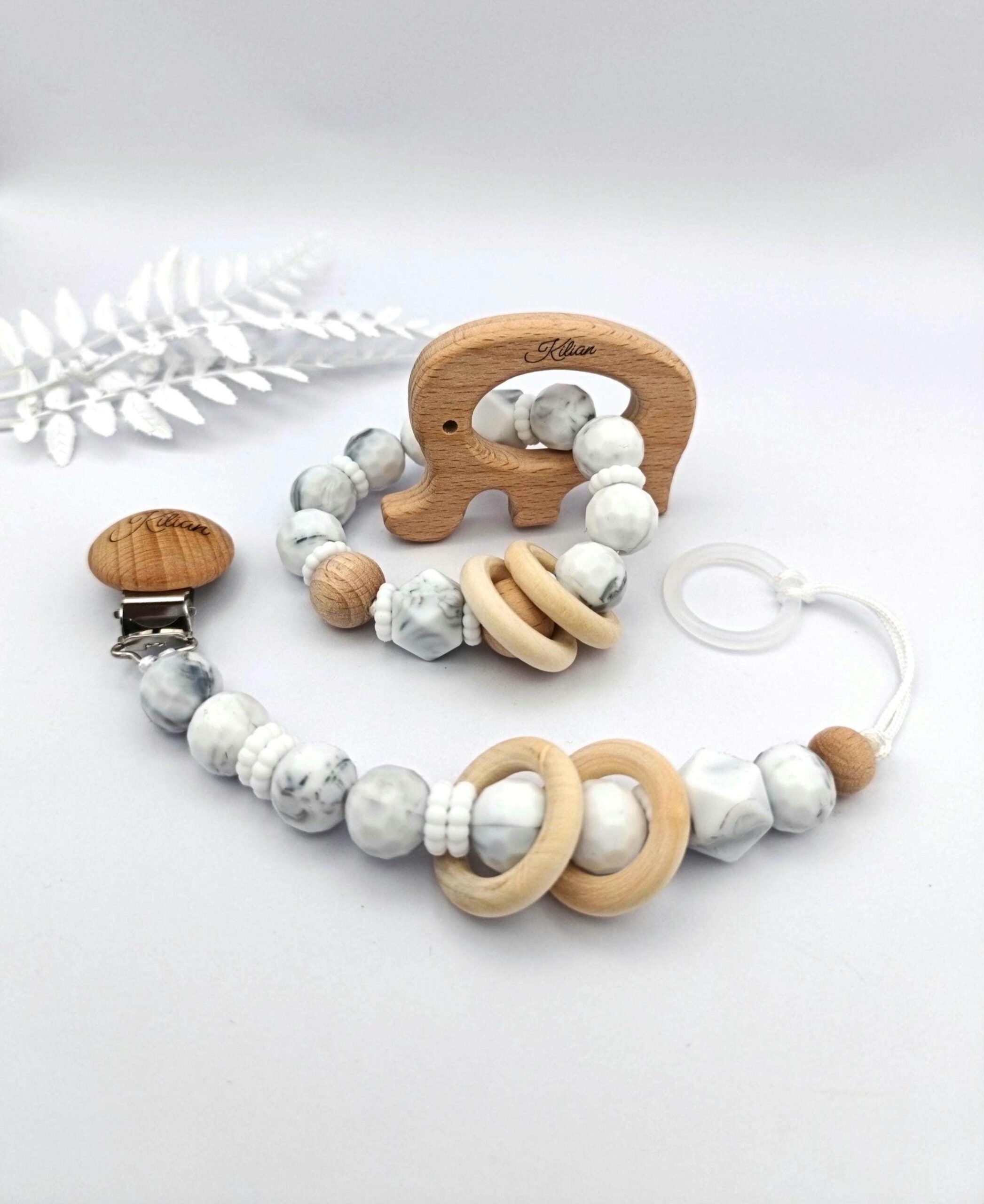 Personalisiertes Baby Geschenkset mit Gravur – Schnullerkette mit Namen & Greifling im Marmor-Design – Geschenk zur Geburt, Taufe, Babyparty